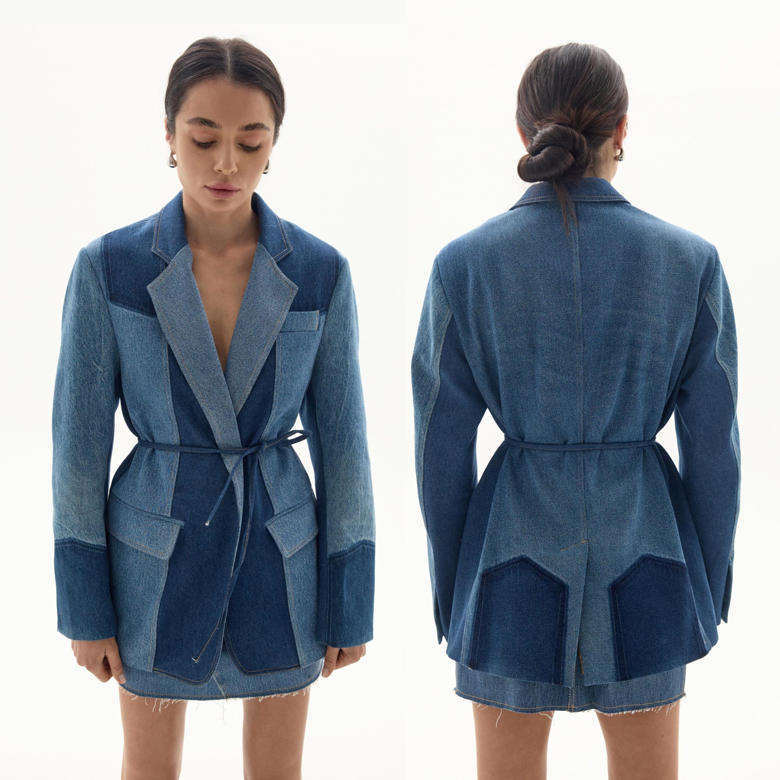 Vintage denim jacket made in a patchwork technique. Women’s blazer crafted from upcycled denim. Upcycled clothing.