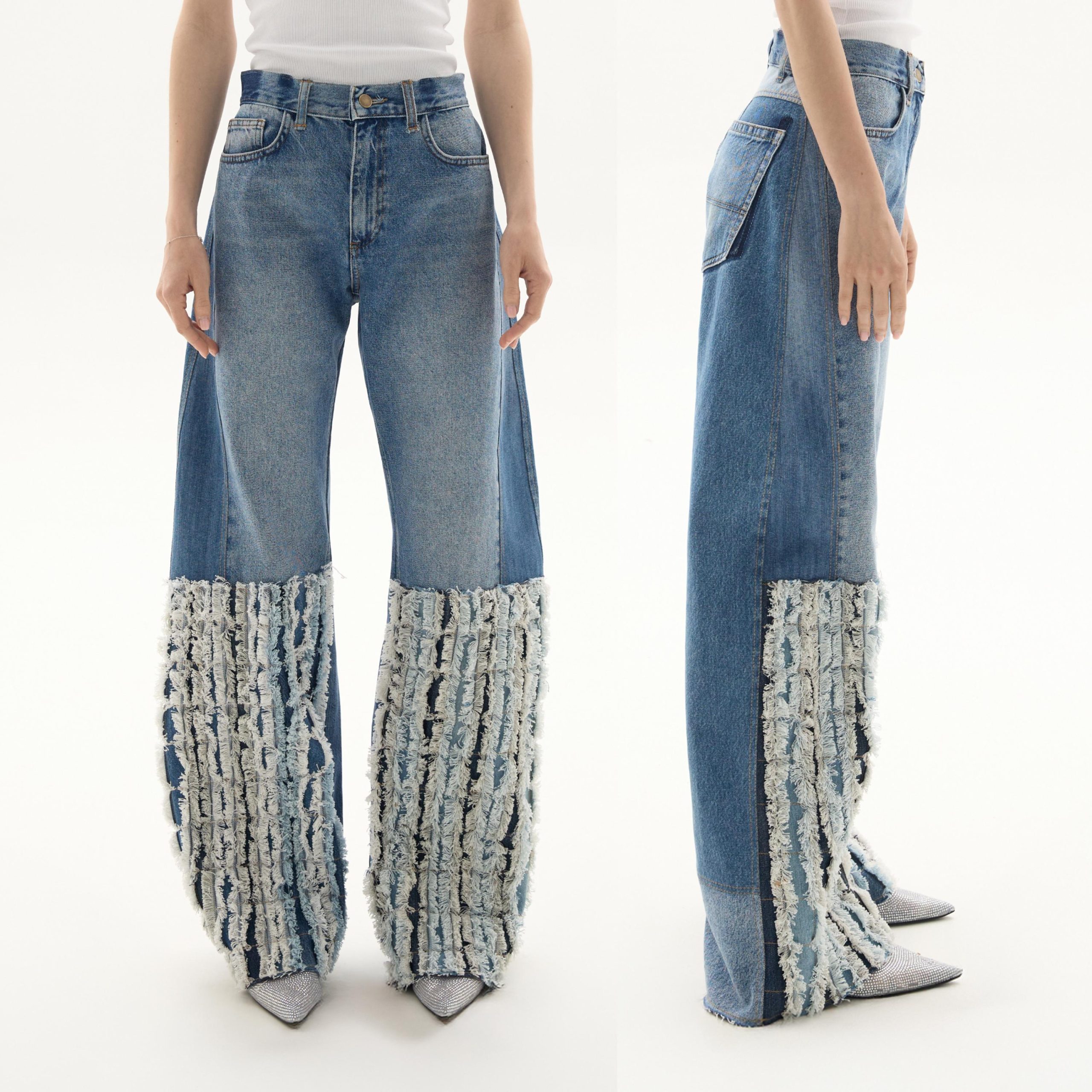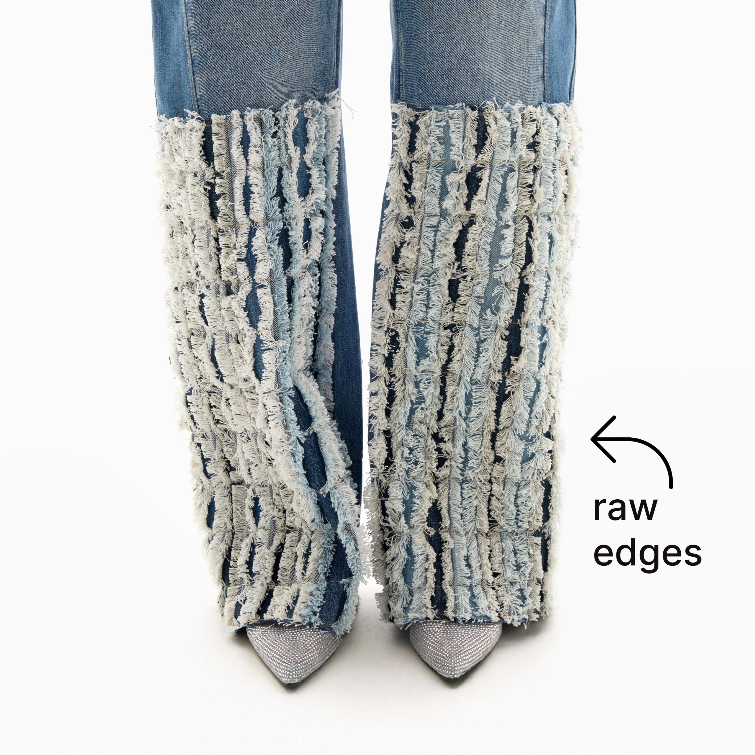 The uniqueness of jeans lies in the texture. The fabric features multiple layers of frayed and raw-edged denim strips sewn vertically.
